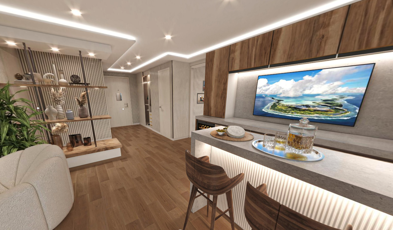 Wonder, a 1,273 square feet two bedroom, two bathroom residence with double sized balcony, featuring a built-in outdoor bar and open plan living area with a large central bar overlooking the ocean.
