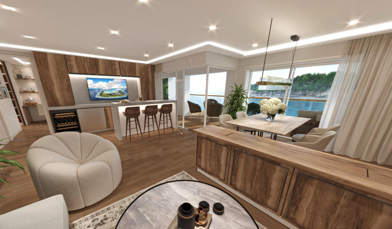 Storylines private residence cruise line introduces a new collection of upscale homes at sea. The company has been primarily focused on providing more affordable entry level options into the condo ship market until this time, with the vast majority of units for sale being studio and one bedroom homes in the 237 to 754 square foot range with starting prices around $350,000. However, the largest two story penthouse residences at 1529 square feet and $8M were in short supply and there were many consumer requests for intermediate two and three bedroom options.
